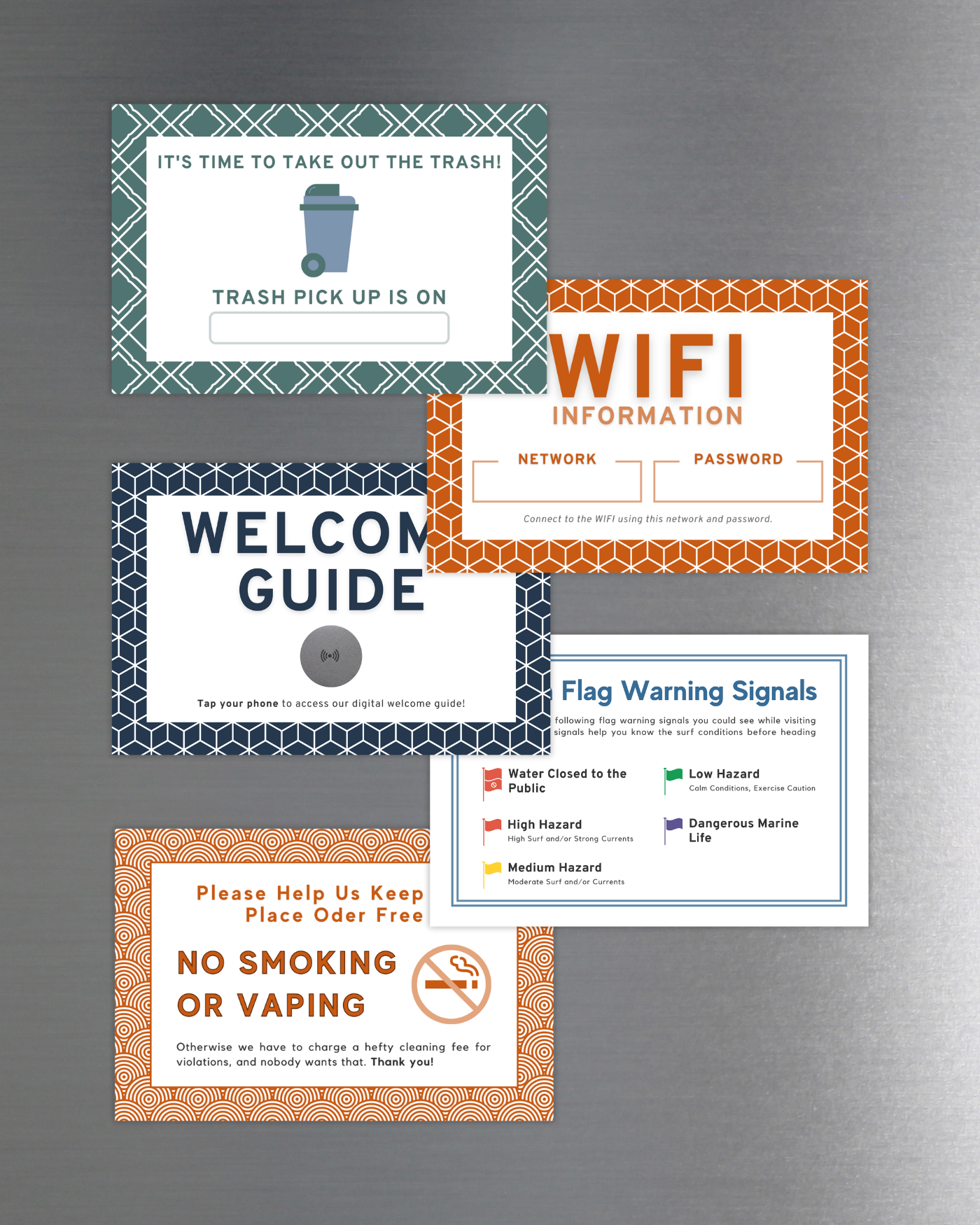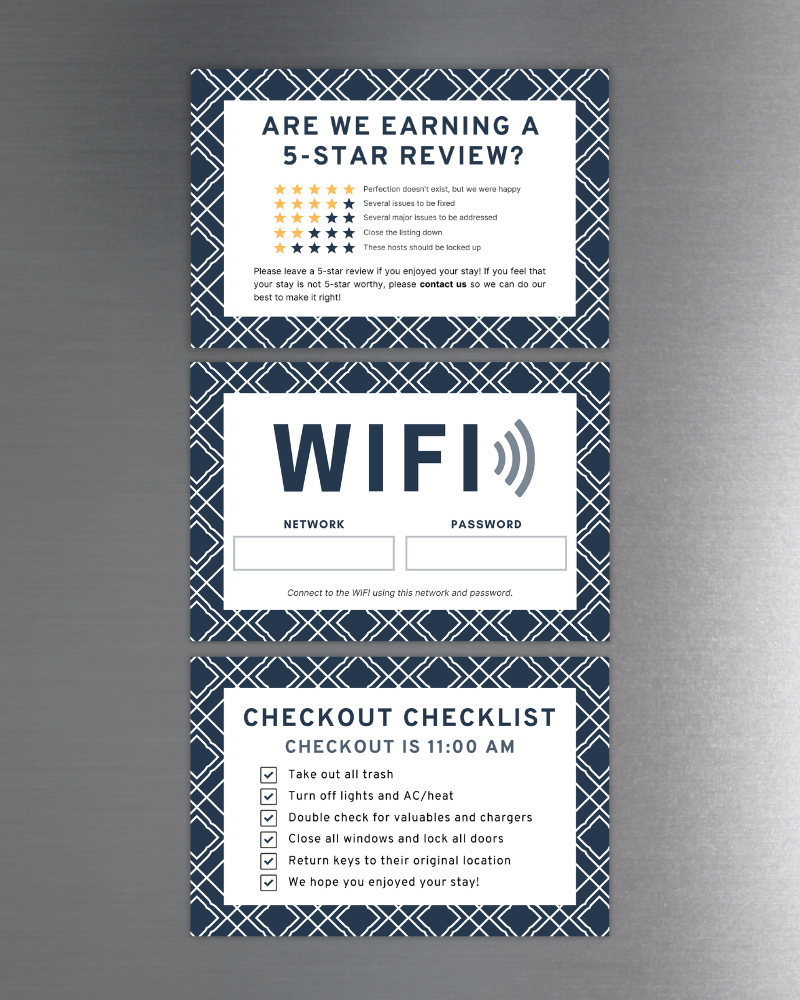 Still getting texts asking for the WIFI? Or do your guests keep forgetting to take out the trash? These magnets handle the FAQs with style. From welcome guides to no-smoking signs, they deliver essential info where guests need it most so you can enjoy a little peace and quiet.