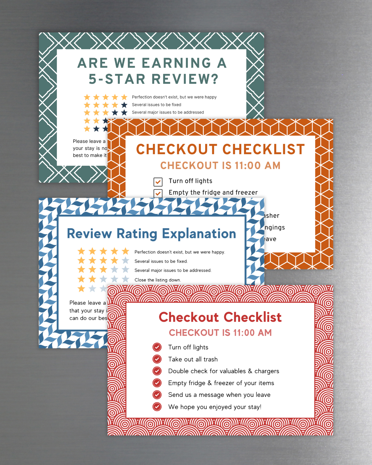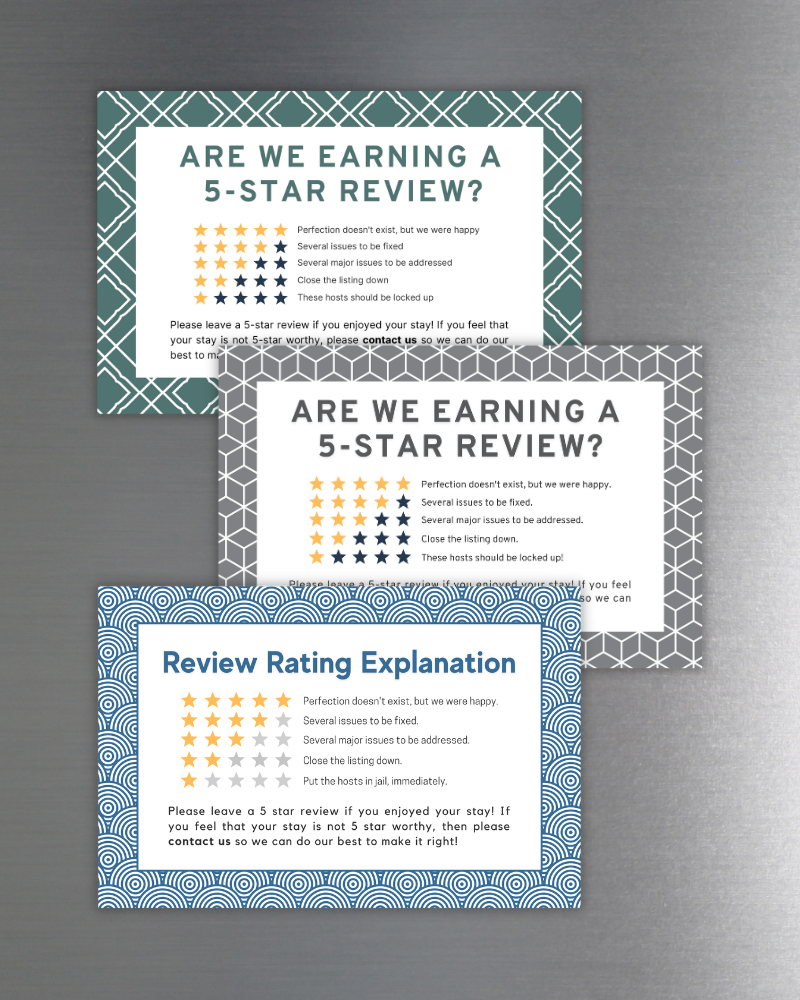 Guests say they loved the stay but leave 4 stars anyway? These rating explanation magnets help guests understand how Airbnb's system works, and why a 5-star review matters. Clear, friendly, and designed to live where they'll actually see it.