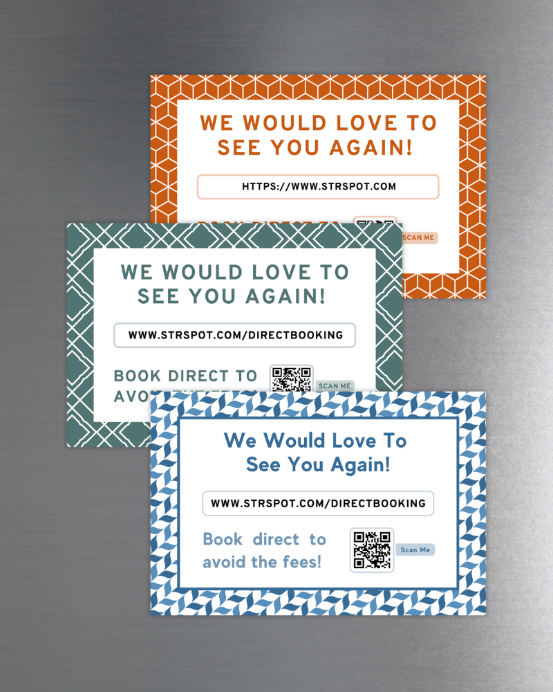 Guests are most likely to rebook while they're still enjoying their stay, so why wait until after checkout? These magnets subtly showcase your direct booking info when it matters most. You save on fees, and they get a shortcut back to you.
